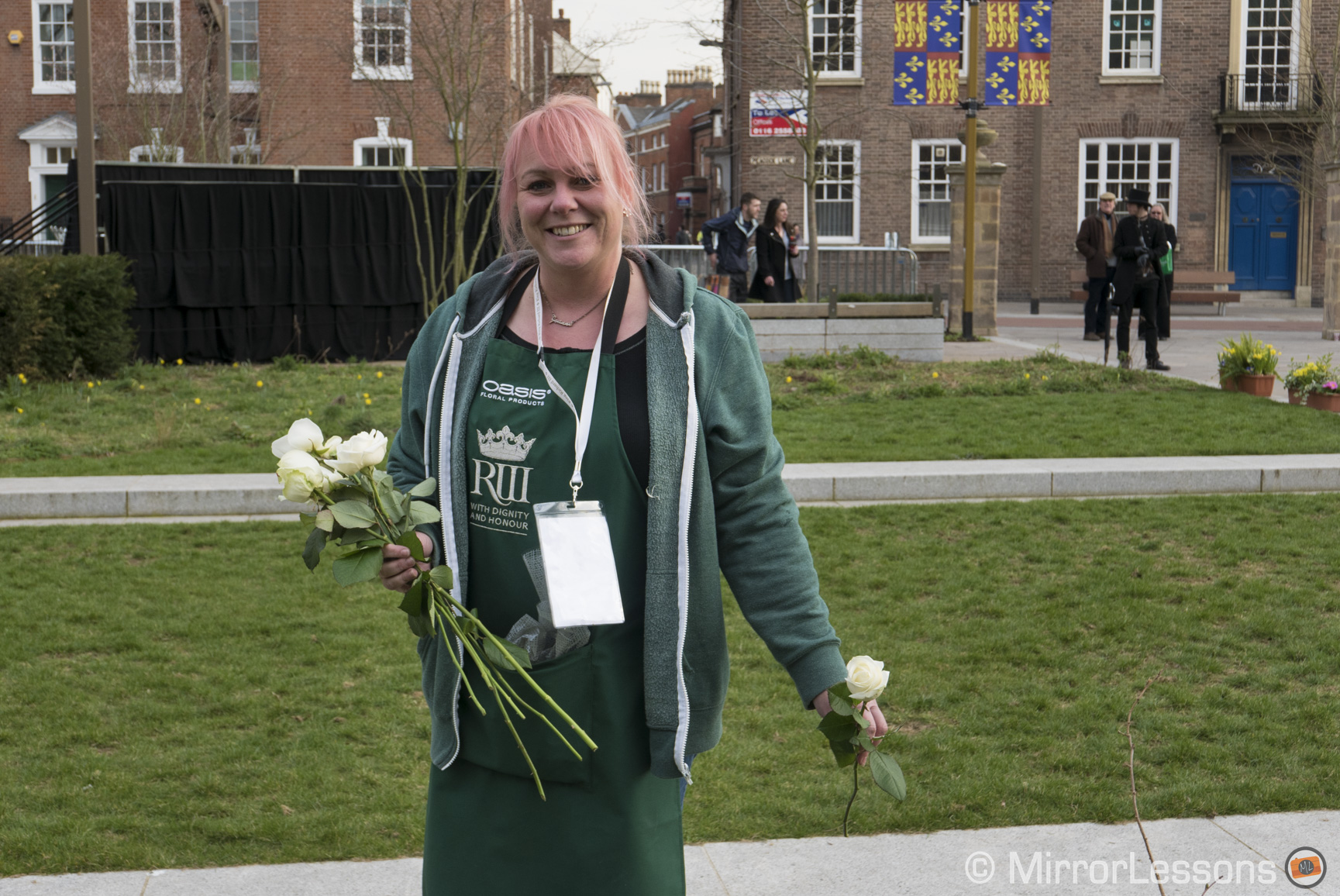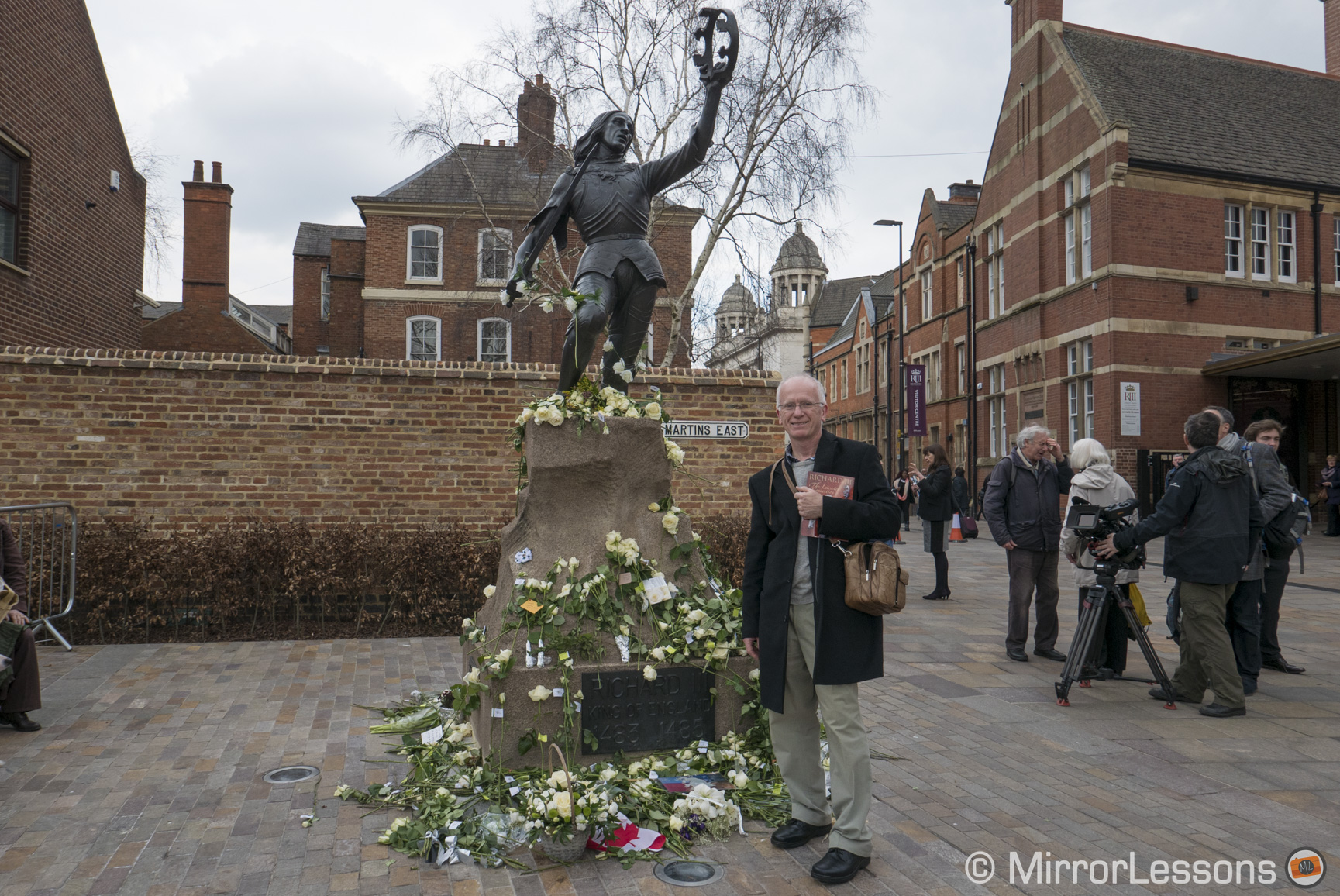 I started out with some photos of the city and how the event was celebrated in posters. As I approached the cathedral there was a fence where hundreds of ribbons had been tied as people were asked to say sorry to Richard for the way he was treated. This was followed by an opportunity to try to capture the mood of the people. The cathedral was surrounded by an eerie silence. People wandered around lost in thought about what was transpiring around them. Some were tying ribbons, others looking at the white roses or the statue of Richard.